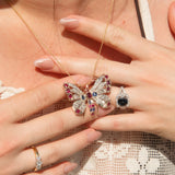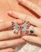 Betsy, a Victorian butterfly pendant, encrusted with glistening rubies, sapphires, and diamonds, unfolds her wings in a harmonious dance of 9 carat gold and silver.
