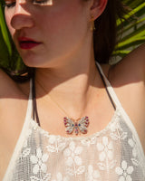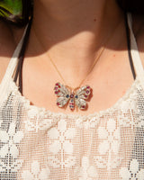 The butterfly pendant features twelve deep red to pinkish red rubies measuring from 4.90 to 2.30x2.50 millimetres and five greyish blue sapphires measuring from 3.90 to 2.70x2.10 millimetres. The eyeballs of the butterfly are made from 1.50 millimetres round cabochon red glass. The main section of the wings of the butterfly contain thirty-two old rose cut diamonds measuring from 1.10 to 1.70 millimetres. All gemstones exhibit minor surface abrasions and wear consistent with the age of the piece. These characteristics are typical for jewellery of this period and do not significantly impact the item's structural integrity or aesthetic appeal.