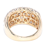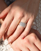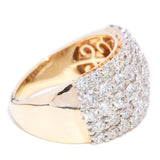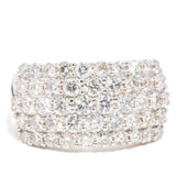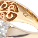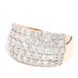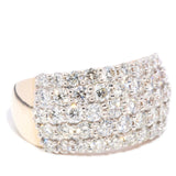Dinah, a diamond cluster ring featuring five exquisite rows of shimmering diamonds across a domed, is set in resplendent 9 carat gold with a filigree inner band.