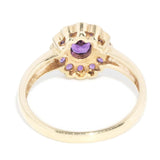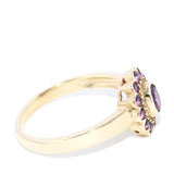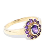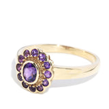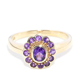 Embrace the enchanting allure of the 1970s with the Danique amethyst cluster ring, a stunning creation in 9 carat gold. Rich purples dance within a cluster of shimmering gemstones, invoking a sense of mystery and elegance. This piece, where vintage artistry meets modern sophistication, captures light beautifully, making it a captivating addition to any collection.