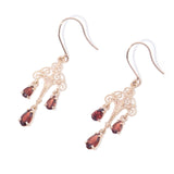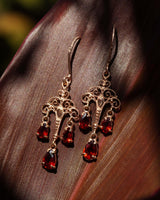 Amelie's gorgeous teardrop garnets cascade like whispers of enchanting tales in the caress of evening light. Fashioned in millgrain 9 carat rose gold with Edwardian grace, she tells a story of revival, as gemstones reborn echo the artistry of her era.
