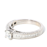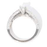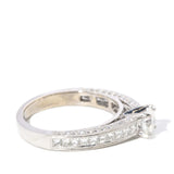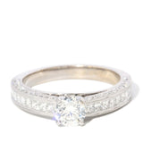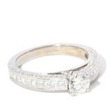 The central round brilliant cut diamond is estimated to weigh 0.50 carats with G colour and P1 clarity grades. The princess cut diamonds and the smaller round brilliant cut diamonds are estimated to total 0.64 carats with G to H colour and SI clarity grades.
