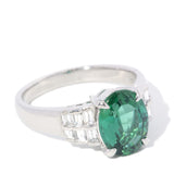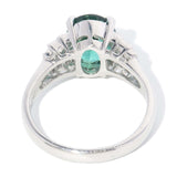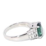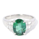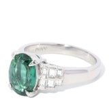 The faceted oval tourmaline is estimated to weigh 3.0 carats, is a bright intense bluish-green colour, and measures approximately 10.7x8.3x5 millimetres. The baguette cut diamonds ate estimated to total 0.46 carats with F to G colour and VS to SI clarity grades.