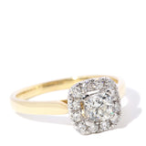 The centre cushion cut diamond weigh 0.54 carats, is G colour and SI1 clarity grade. It is inscribed IGI M3C54068. The twelve surrounding round brilliant cut diamonds are estimated to weigh 0.25 carats, are G colour and P1 clarity grades.