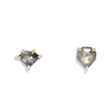 These earrings feature two unique shield-cut, salt and pepper diamonds. These stones have a steel grey colour in the transparent body, with the characteristic heavy inclusion pattern. The diamonds weigh a total of 1.03 carat.