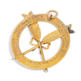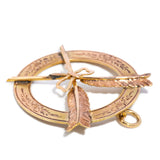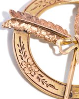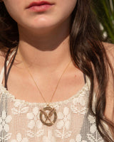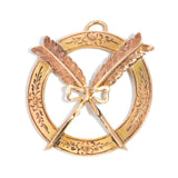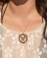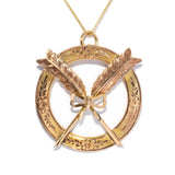 Eowyn, a darling 1929 open disc pendant, embodies contemporary sophistication and timeless allure, gracefully crafted in 9 carat gold with crossed 14ct gold feathers spanning her open centre.
