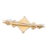 Wendy, an antique circa 1910s bar brooch crafted in 15 carat gold, features a captivating trio of garnets and fourteen seed pears, set around the diamond setting and to the sides.