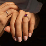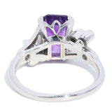 Sereia, an enchanting 1960s emerald cut amethyst ring paired with diamond accents, glistens in 18 carat white gold with elegant bypass shoulders.