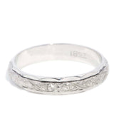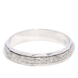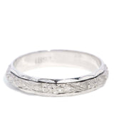 Freda is a meticulously crafted repoussé floral patterned band of 18 carat white gold, embodying a seamless balance of nature and artistry.