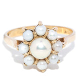 Dahlia, a resplendent 1970s button pearl ring framed by a delicate cluster design, is gracefully set in 9 carat yellow gold.