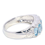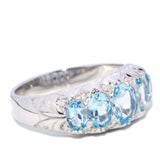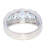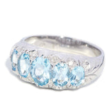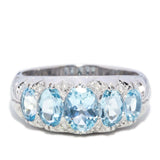 The five pale blue, oval cut aquamarines graduate in size from 7.00x5.00 to 5.00x3.00 millimetres. The twelve round brilliant cut diamonds are estimated to total 0.09 carat, with a H to I colour and P clarity grade.