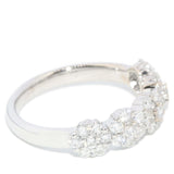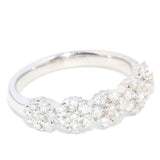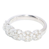 Lenora, a half eternity ring resplendent with five mini flower clusters of diamonds, is crafted in 9 carat white gold, exuding a blend of contemporary charm and vintage allure.