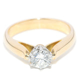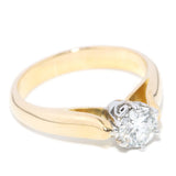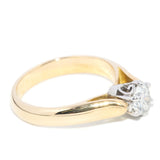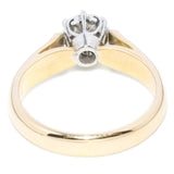 Rosie, a vintage 1960s diamond solitaire ring, features a radiant diamond nestled in a contrasting white gold setting atop a resplendent yellow gold shank of 18 carats.