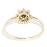 Briony, a petite cluster ring from the 1980s, showcases a vibrant diamond embraced by a constellation of verdant diamonds, all set in lustrous 9 carat gold.