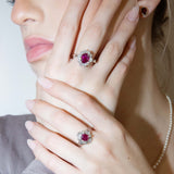 An enchanting jewel radiant with purpose, the Maya ruby & diamond halo ring marries vibrant deep pinkish red rubies with shimmering diamonds, each whispering tales of forgotten treasures. Her platinum embrace gleams with artisanal grace, a brilliant testament to sustainable beauty reborn.