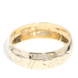 Willa, a darling engraved curved band lovingly sculpted in 9 carat yellow gold, carries an aura of gentle refinement.