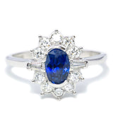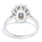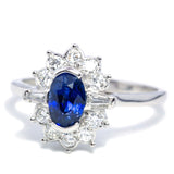 Bree, a sumptuous cluster ring featuring an alluring oval blue sapphire, is beautifully set within a constellation of shimmering diamonds, reminiscent of a starburst, all cast in 18 carat white gold.