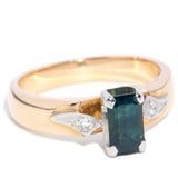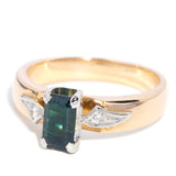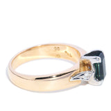 Bridie, an exquisite trilogy ring featuring a mesmerizing emerald cut blue-green parti sapphire embraced by twinkling diamonds, is crafted in a harmonious blend of platinum and 9 carat gold.