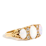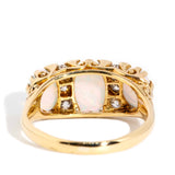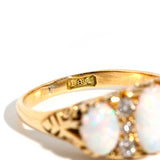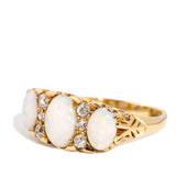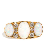 The solid oval Australian opals display abundant flashes of orange, green and blue play of colour. the centre opal measures approximately 8.8x6.0 millimetres, and the two side opal measure approximately 6.5x4.7 millimetres. The centre opal has very slight surface wear that is hardly visible. The six old cut diamonds are estimated to total 0.28 carats with G colour and SI to P1 colour grades.