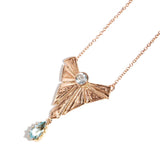 Lovingly crafted in 9 carat rose gold and set with luminous aquamarines, The Maude Necklace is a vintage treasure. Like an angel with arms outspread and reaching to the heavens, she is ready to float away, both ethereal and bound to the earth.
