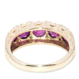 Charlotte, a contemporary ring crafted from 9 carat gold, features a London Bridge setting cradling five pinkish red rubies gracefully alternating with delicate duets of diamonds.