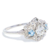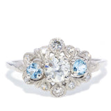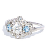Libby, an Art Deco ring resplendent with and central Old Cut diamond and flanking aquamarines, is meticulously set in 18 carat white gold with diamond accents.