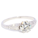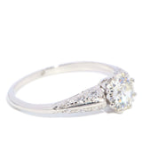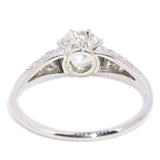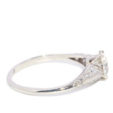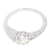 Masie, a 1930s platinum ring, features a central old cut claw set diamond complemented by small diamonds cascading delicately down her knife edge shoulders.