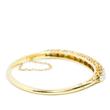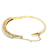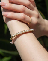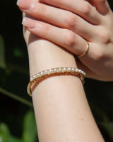 Lainey, a filigree bangle delicately woven in 14 carat yellow gold, cradles lustrous seed pearls and dazzling diamonds in a dance of refined artistry.