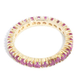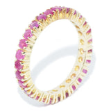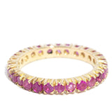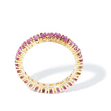 Alma, a full eternity ring, showcases a dazzling corridor of rubies ensconced in a classic claw setting, fashioned from rich 14 carat yellow gold.