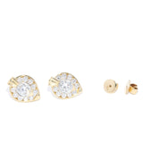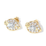 Seraph, diamond stud earrings radiating with brilliance, hold central rubover diamonds with exquisite channel set diamond halos, crafted in rich 18 carat yellow gold.