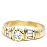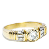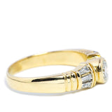 Valentina, a diamond ring, radiantly gleams in 18 carat yellow gold, her bezel set diamond and baguette diamond shoulders testament to the enduring allure of this precious metal.