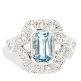 The bright blue emerald cut aquamarine is 1.54 carats and measures approximately 9 x 5.7 x 4.4 millimetres. The round brilliant cut diamonds total 0.39 carats with F colour and VS clarity grades.
