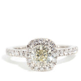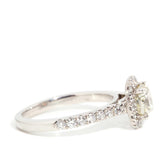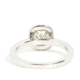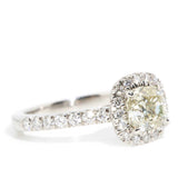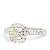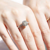 Our stunning Soniqa platinum ring holds an enchanting 1.60 carats of diamonds, with the central IGI certified cushion cut diamond resting within a halo of shimmering smaller diamonds and further diamonds cascading down her shoulders.