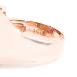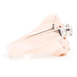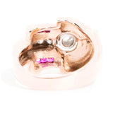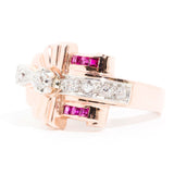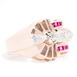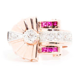 Forged in 14 carat rose gold, this circa 1940s vintage wonder is truly a sight to behold. Reminiscent of a sundial this gorgeous ring fans out in layers of rose gold that meet two sparkling rows of red rubies. The centre of the ring is adorned with a romantic old cut diamond accompanied by additional glittering old cut diamonds spreading across the ring. We have named this vintage adornment The Sundial Ring. She is as unique as the one who wears her and is sure to become a treasured part of any vintage collection.