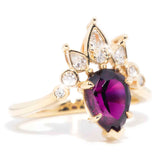 The pear shape rhodolite garnet is 2.06 carats. The pear shape brilliant cut diamonds and the round brilliant cut diamonds total 0.17 carats and are F colour and VS clarity.