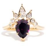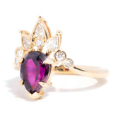 Lovingly handcrafted in 14 carat yellow gold, this gorgeous contemporary ring is a captivating flourish of elegance. The gleaming tapered band flows into a stunning gallery holding a beautiful array of jewels. The lower section cradles a stunning pear shape rhodolite garnet, and the upper section, in the design of an enchanting tiara, is home to a plethora of shimmering rub over pear and round brilliant cut diamonds. We have named her The Evie Ring, and she truly is as one-of-a-kind as the one who wears her, a wonderfully unique ring where the fabulous display of gems speaks volumes of true love and devotion.