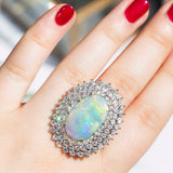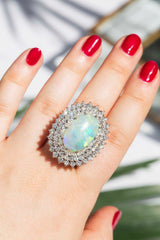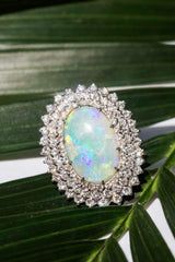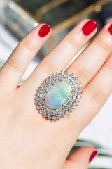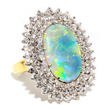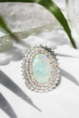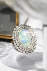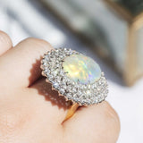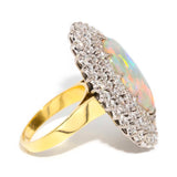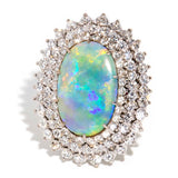 Embodying the romance and beauty of the Australian outback and crafted in 18 carat gold, this stunning vintage opal ring is surrounded by processions of sparkling white diamonds. Flashing blue, red and green, reminders of sunsets on heavenly summer days. The Amelia Ring is pure opulence made to be worn and wondered at, the perfect addition to any collection.