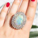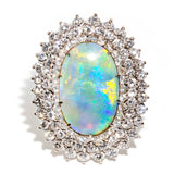 The solid Australian grey base opal displays bright broad flashes of orange, green, blue and yellow play of colour. It is estimated to weigh and measures approximately 21.46x13.90x1.35 millimetres. Please note the opal has slight surface wear and a hairline fracture which are consistent with the age and wear of the stone. The round brilliant cut diamonds are estimated to total 2.70 carats with F to G colour and SI to P1 clarity grades. They measure from 1.60 to 2.20 millimetres.