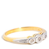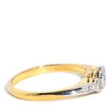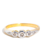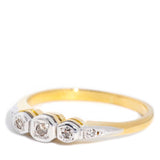 A lovely trio of round brilliant cut diamonds, flanked by two smaller diamond, rests in a white gold setting atop a charming yellow gold band. Quietly beautiful and utterly charming, The Min Ring shimmers as day transition to night and is a darling everyday ring.