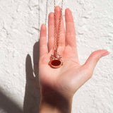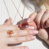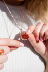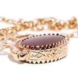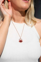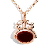 The Callie Pendant & Chain is a gorgeous vintage adornment that ribbons and scrolls its way to a spinner of crimson carnelian and onyx. Her precious gems are embraced by beautiful garlands of flowers carved into 9 carat rose gold.