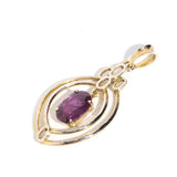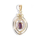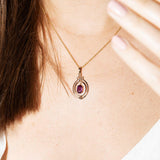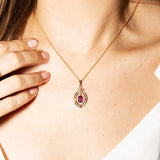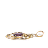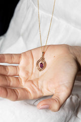 Our darling Ally Pendant is crafted beautifully in 8 carat yellow gold. Her marquise-shaped double wire frame setting, holds an oval purplish-red ruby at her centre. Simply delightful, she is perfect to rest close to your heart.