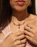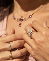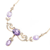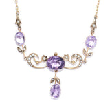 The gorgeous antique Calla necklace sways with the grace of forgotten eras, with four oval cut amethysts, deep and soulful, nestled amidst dainty seed pearls on a swirling frame. Forged from luxuriant 9 carat gold, she cradles whispers of nature’s embrace, whispering stories of elegance and bygone charms.