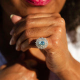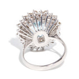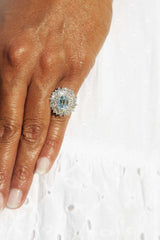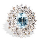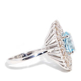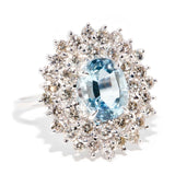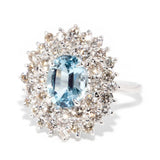 A shared day in the snow, the sun beaming through snowflakes fracturing the light like facets of diamonds. As the light dims, he asks "Will you....?" The Andrea Ring sits cushioned in the velvet box. Exquisitely crafted in 14 caratwhite gold and set with an 1.79 carat icy-blue aquamarine surrounded by layer upon layer of sumptuous diamonds totalling 1.56 carats, she is a true delight, ready for that most perfect of moments.