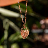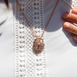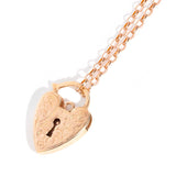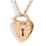 Our circa 1960s Austin Heart Padlock & Chain has been lovingly crafted in 9 carat rose gold. Her heart shaped locket is beautifully embellished with swirling leaves in perfect symmetry. She is an exquisite gift for the one you love, where your heart can now sit close to hers.