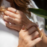 A captivating 18 carat gold display of rich colour, the Moriah Ring dazzles with a sapphire at her heart, encircled by glowing garnets. An intricate cluster of depth and allure.