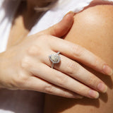 Thoughtfully crafted in gleaming platinum, this stunning contemporary cluster ring has a fabulous IGI-certified pear cut diamond with a shimmering border of round brilliant diamonds and a plethora of diamonds cascading down the band. This splendour is named The Helina Ring. She is a wonderful symbol of commitment and love, perfect for marking momentous life occasions and destined to endure for eternity.