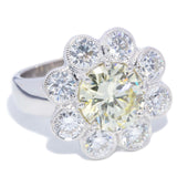 One exceptional round brilliant-cut natural diamond weighing 2.52 carats, featuring a vibrant Fancy Yellow colour and VS1 clarity. This magnificent centre stone is showcased within a cluster of eight large round brilliant-cut diamonds, estimated to total 1.60 carats with an F colour and VS clarity.
