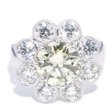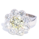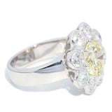 Flora, a gorgeous flower cluster ring with an incredible 2.52 carat fancy yellow diamond of stunning cut and clarity set within 1.60 carats of white diamonds, is meticulously crafted in radiant 18 carat white gold.