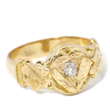 Chantal, a resplendent 1930s heart signet ring adorned with an old mine cut diamond set in an exquisite star pattern, shines brilliantly against her 18 carat gold band with delicately textured clover-style shoulders.