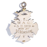 Our Henry 1929 Cross Award Pendant, crafted in 9 carat gold, is a testament to enduring legacy. Intricate floral engravings dance across the ornate cross, framing a central disc awaiting personal inscription. This pendant is not merely an accessory; it's a tangible link to history, a symbol of recognition, and a treasured heirloom poised to carry stories for generations to come.